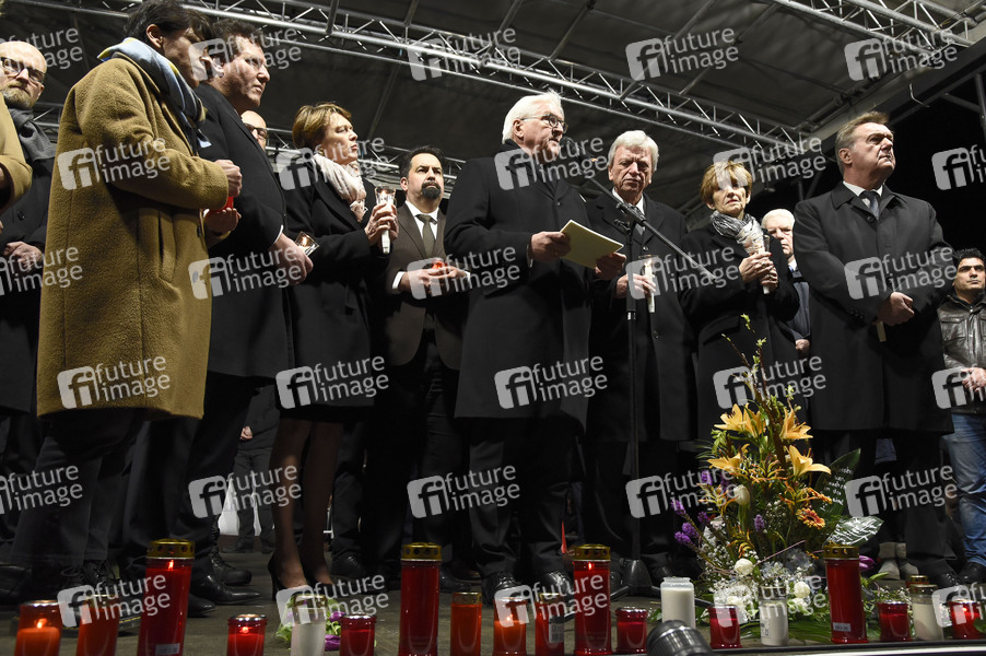 Elke Büdenbender, Aiman Mazyek, Frank-Walter Steinmeier, Volker Bouffier, Volker Bouffier, Ursula Bouffier und Claus Kaminsky bei einer Mahnwache für die Opfer des rechtsextremen Anschlags auf dem Marktplatz. Hanau, 20.02.2020