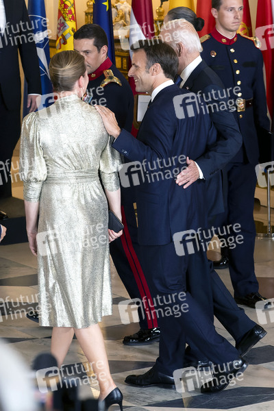 Mette Frederiksen, Emmanuel Macron und Joe Biden beim Fototermin zum Gala Dinner anlässlich des Treffens der Nato-Staats- und Regierungschefs im Palacio Real. Madrid, 28.06.2022