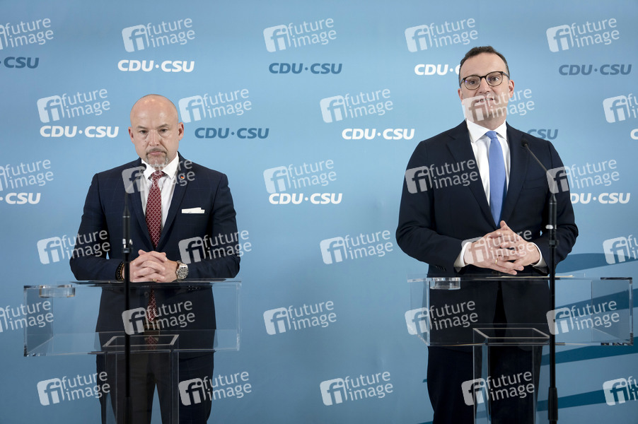Alexander Hoffmann und Jens Spahn beim Pressestatement zur Fraktionssitzung der CDU/CSU-Bundestagsfraktion im Reichstagsgebäude. Berlin, 03.06.2025