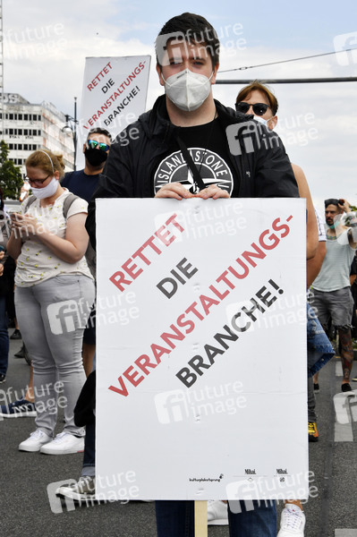 Mit einem Protestmarsch von derAlexanderstraße 3 zur Kundgebung am Bebelplatz, weisen Berliner Spielstätten, Veranstalter*innen, Techniker*innen, Bühnen- und Messebauer*innen, Außenwerber*innen, Security- und Gastropersonal sowie weitere Dienstleister*innen aus der Kultur- und Eventbranche auf ihre prekäre Lage und den eklatanten Mangel an Perspektiven hin. Berlin, 24.07.2020