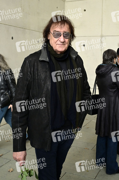 Dieter 'Maschine' Birr von den Puhdys bei der Gedenkfeier für den verstorbenen Gitarristen von City, Fritz Puppel, im Krematoriumsgebäude Baumschulenweg. Berlin, 10.04.2024
