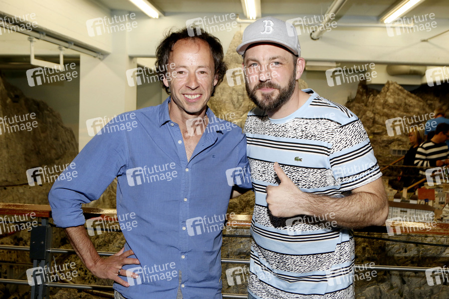 Gerrit Braun und Das Bo bei der Präsentation des offiziellen Musikvideos von Das Bo zur Fussball WM mit einem Liveauftritt im Modell von der Schweiz im Miniaturwunderland. Hamburg, 27.05.2014