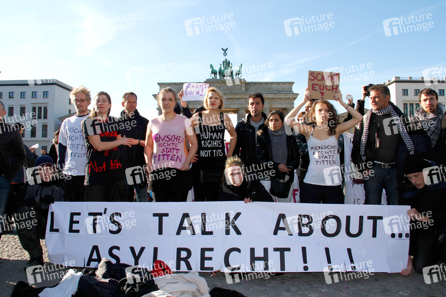 Flüchtlinge und Aktivisten, die vor dem Brandenburger Tor für eine neue Asylpolitik demonstrieren, werden von Politkerinnen der Piratenpartei unterstützt, Berlin