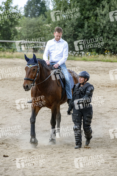 Sylke Schneider und Michael Kretschmer auf dem Pferd Rübezahl beim Besuch der Polizeireiterstaffel in Großerkmannsdorf. Radeberg, 23.07.2020