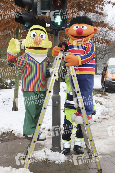 Bert und Ernie bei der Einweihung der Sesamstraße Ampelmännchen am Hugh-Greene-Weg. Hamburg, 13.01.2026
