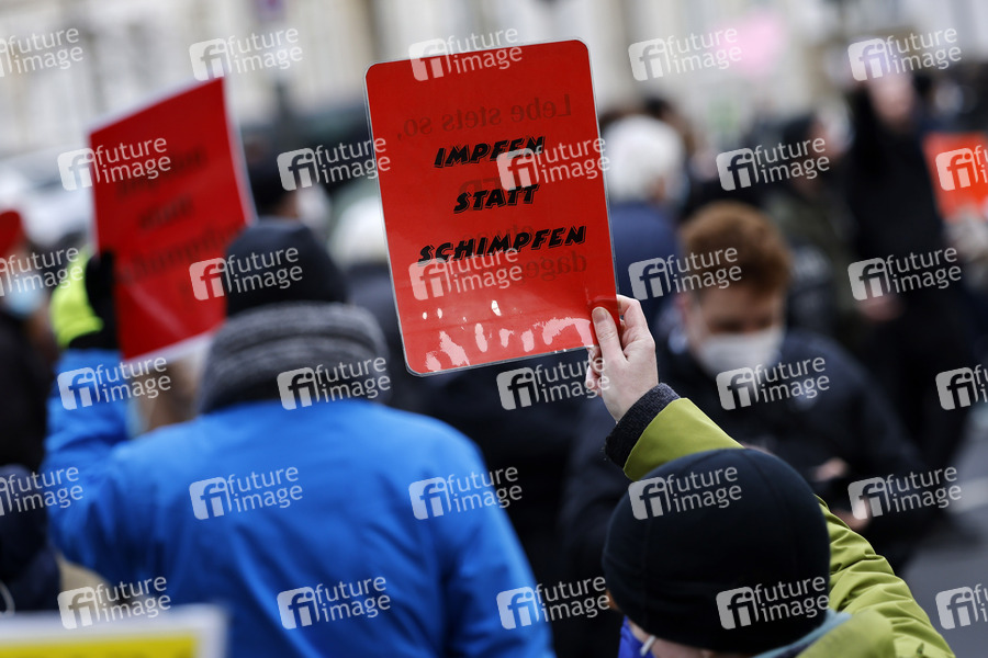 Bei einer angemeldeten Demo unter dem Motto 'Frieden, Freiheit, Selbstbestimmung - Freie Impfentscheidung' demonstrierten etwa 10.000 Gegner einer Impfpflicht mit einem Spaziergang gegen die Corona-Maßnahmen der Bundesregierung und für eine individuelle Impfentscheidung, Grundrechte und 'unversehrte' Kinder - darunter auch viele Pflegekräfte, die wegen der Impfpflicht im Gesundheitsbereich ihren Job zu verlieren drohen. Im Bild Teilnehmer einer Gegendemonstration aus dem linken Spektrum. Düsseldorf, 05.02.2022