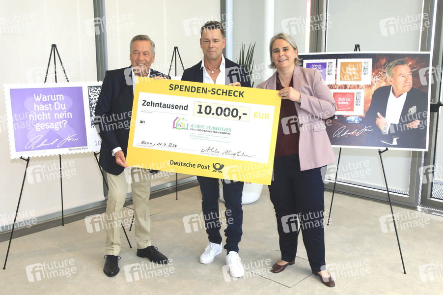 Roland Kaiser, Kai Noack und Nikola Hagleitner bei der Präsentation der Roland Kaiser-Briefmarken anlässlich Kaisers 50 jährigen Bühnenjubiläums im Post Tower. Bonn, 11.07.2024