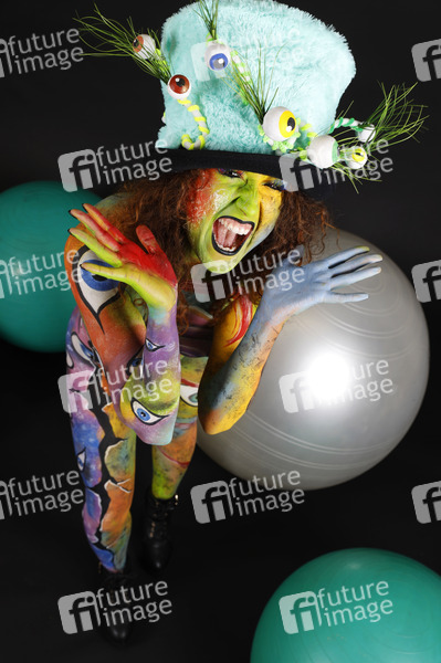 Das World Bodypaiting Festival 2020 fand aufgrund der Corona-Pandemie online statt. Unter dem vorgegebenen Motto 'Psychedelic Circus' verwandelte BodyArt-Künstler Jörg Düsterwald sein Model Lena in einen psychedelischen Mad Hatter. Hameln, 10.07.2020