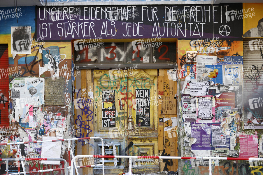 Eingang, Hausbesetzer, Linksextreme, Linkes Wohnprojekt, Linksextremismus, Brandschutz, Räumung, Räumungsklage, Brandschutzgutachten, Begehung, teilbesetztes Haus, Firma Lafone Investments Ltd., Eigentümer, Hauseigentümer, Wahlkampfthema, Berliner Senat, Berliner Politik, linke Szene, Friedrichshain, Brandschutz, Gewalt, Gewaltbereitschaft, Polizei, Polizisten, Polizeieinsatz
