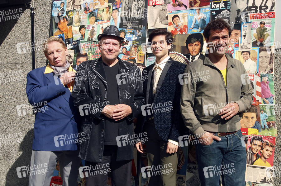 Ben Becker, Rosa von Praunheim, Kilian Berger und Kai Schumann beim Fototermin am Set des ARD Dokudramas 'Der letzte Tanz - Die Rex-Gildo-Story' auf dem rbb-Gelände. Berlin, 16.08.2021