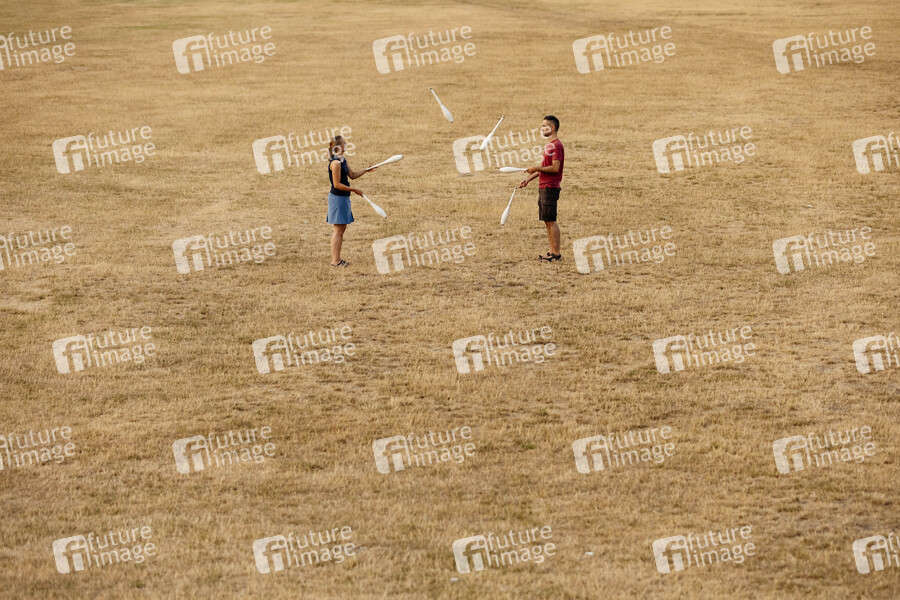 Jongleure auf einer verdorrten Wiese im Rheinpark. Köln, 25.07.2019