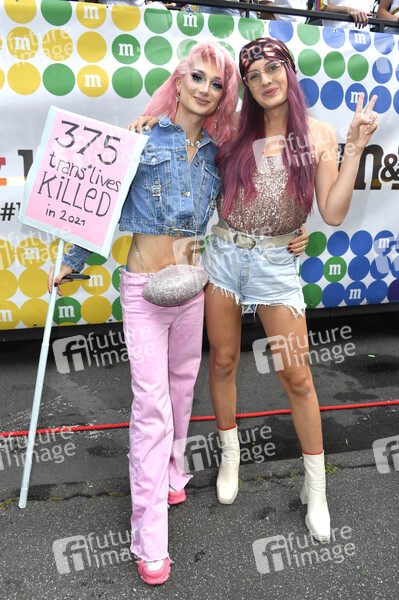 Candy Crash und Leni Bolt vor dem M&M's Truck bei der 44. Christopher Street Day Parade 2022 unter dem Motto 'United in Love! Gegen Hass, Krieg und Diskriminierung' vom Spittelmarkt auf gut sieben Kilometern über Potsdamer Platz und Potsdamer Straße zum Nollendorfplatz, von dort weiter zur Siegessäule und zum Brandenburger Tor. Berlin, 23.07.2022