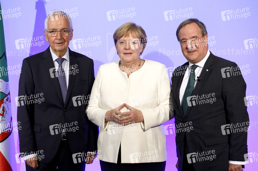 Klaus Töpfer, Angela Merkel und Armin Laschet bei der Verleihung des Staatspreises des Landes Nordrhein-Westfalen 2019 an Klaus Töpfer im WCCB. Bonn, 16.09.2019