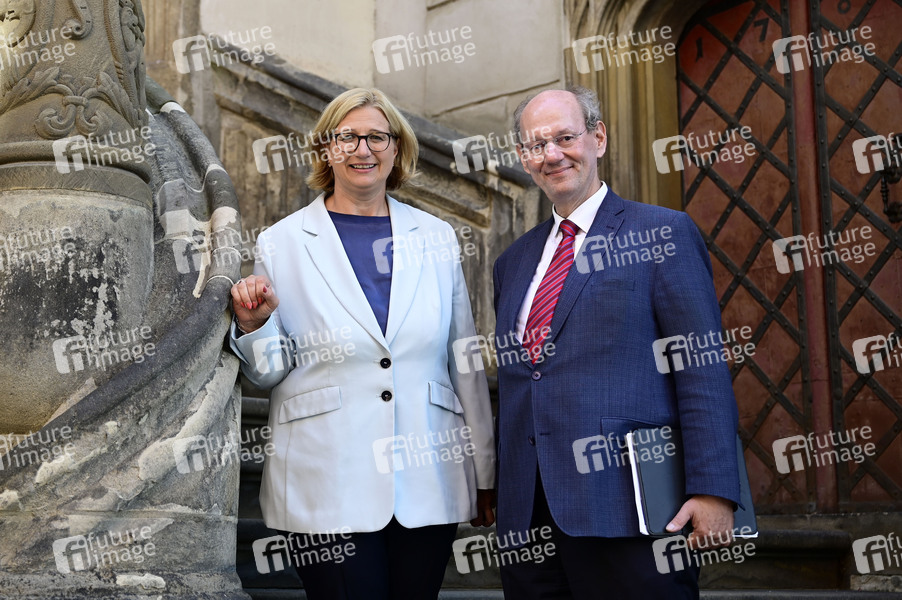 Anke Rehlinger und Harald Baumann-Hasske bei einer Sightseeing-Tour durch die Görlitzer Altstadt, hier an der Rathaustreppe, einer Touristenattraktion am Untermarkt, anläßlich einer Wahlkampfveranstaltung der SPD zur Landtagswahl in Sachsen. Görlitz, 29.07.2024