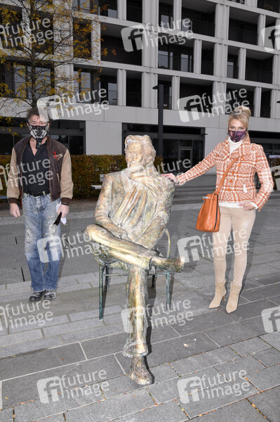 Nikolai Tregor und Ursula Gottwald bei der Ankunft und Präsentation der Bronze-Statue von Helmut Dietl vor dem Andoz Hotel in München-Schwabing. München, 10.11.2020