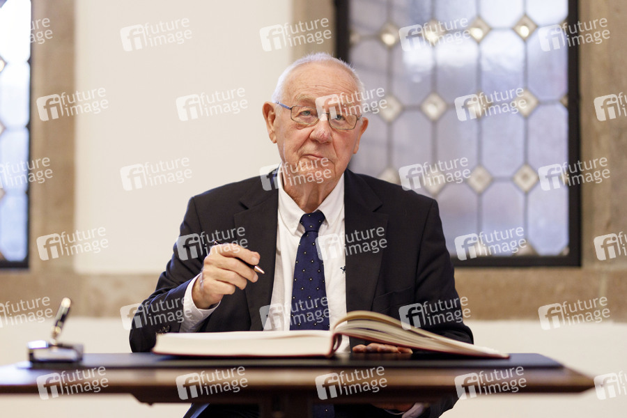 Armin Maiwald beim Eintrag ins Gästebuch - Oberbürgermeisterin Henriette Reker ehrt den Vater der 'Sendung mit der Maus' zu seinem 80. Geburtstag im historischen Rathaus. Köln, 13.08.2020