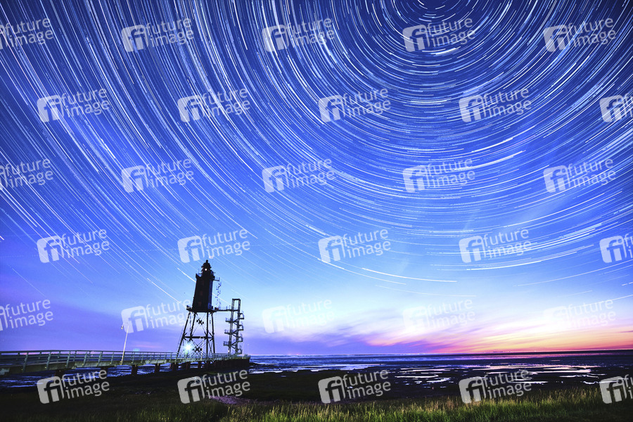 Leuchtturmdenkmal Obereversand an der Wurster Nordseeküste. Der Startrail-Effekt entstand durch Langzeit- und Mehrfachbelichtung und zeigt die Sternenspuren duch die Erdrotation. Dorum-Neufeld, 31.05.2020