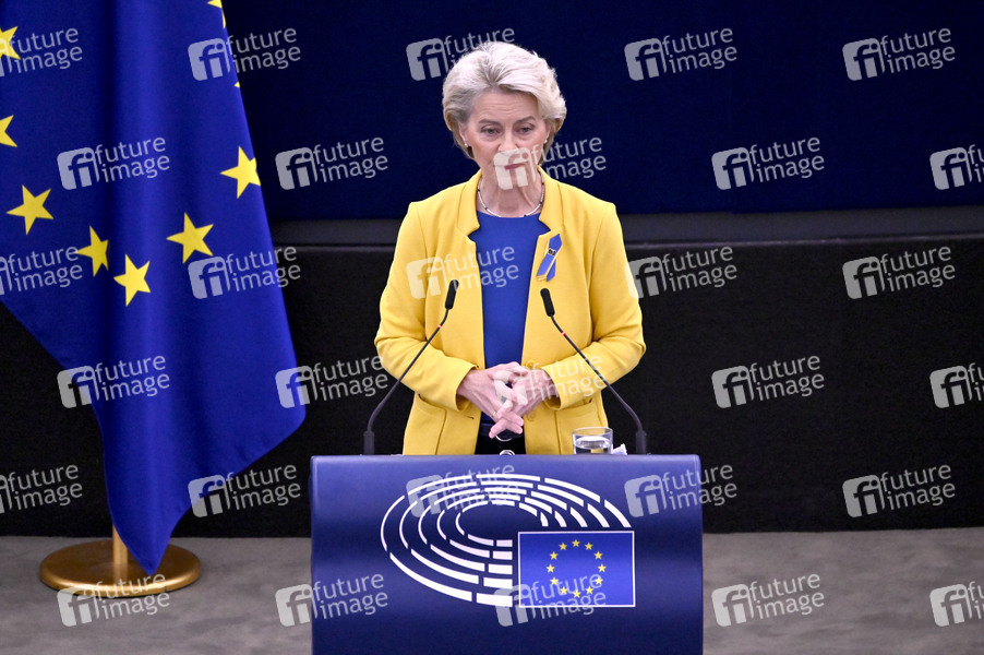 Ursula von der Leyen bei ihrer Rede zur Lage der EU im Plenarsaal des Europäischen Parlaments mit deutlichen Worten zu Russland. Sie lobte auch den Mut der Ukrainer und die Solidarität der Europäer mit ihnen. Straßburg, 14.09.2022
