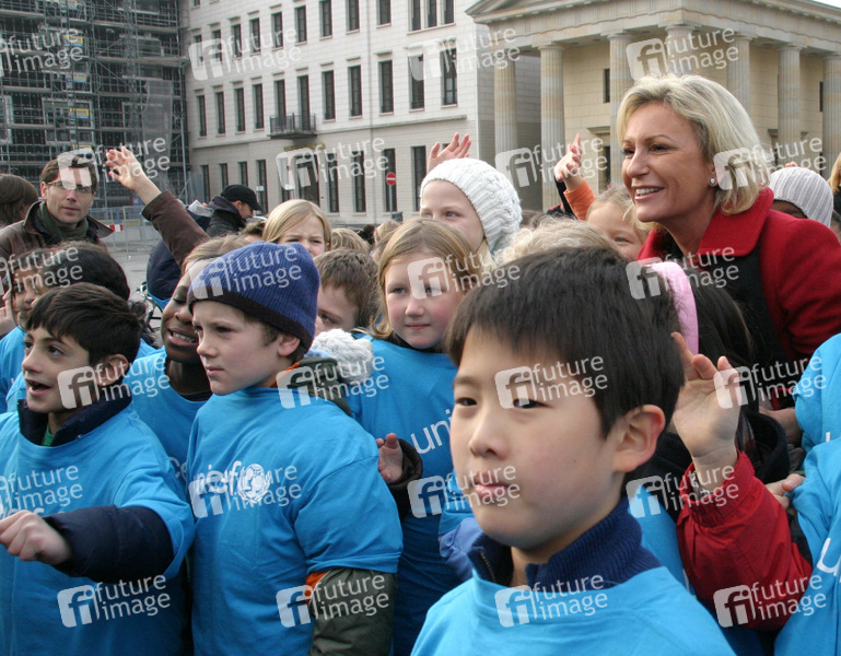 UNICEF Fototermin mit Sabine Christiansen und 90 Schülern und Schülerinnen der Internationalen Schule Berlin vor dem Banner 'A Call From Berlin: Children First - Kinder haben Rechte' am Brandenburger Tor