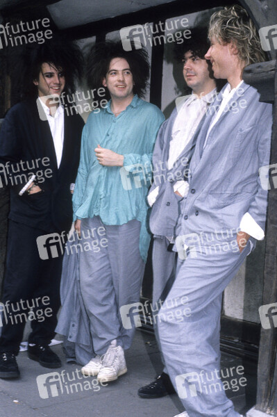 Simon Gallup, Robert Smith, Laurence Tolhurst und Boris Williams von The Cure bei einem Fototermin am Soho Square. London, 15.03.1986