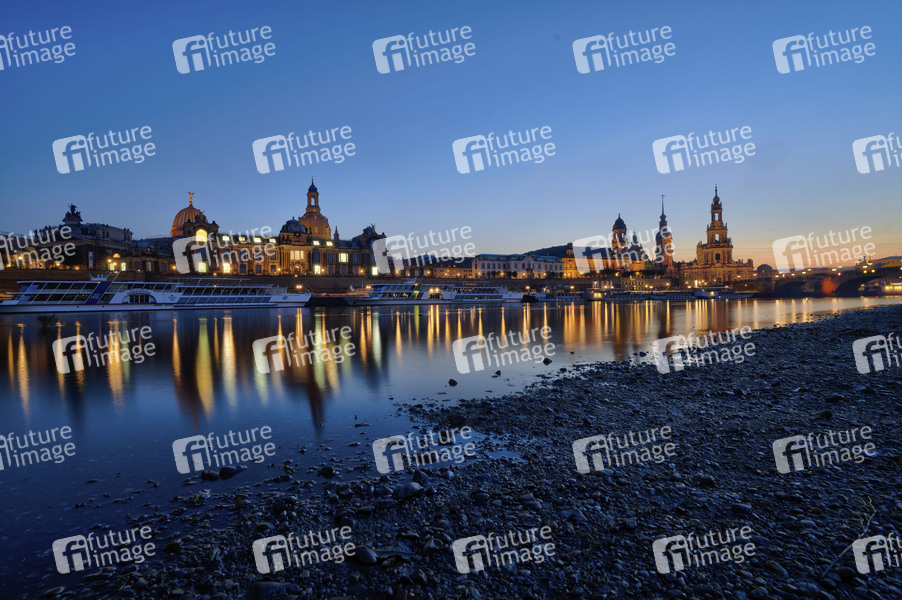 Elbufer mit Blick auf die Frauenkirche, Kathedrale, Dresdener Schloss und Augustusbrücke. Dresden, 30.10.2021