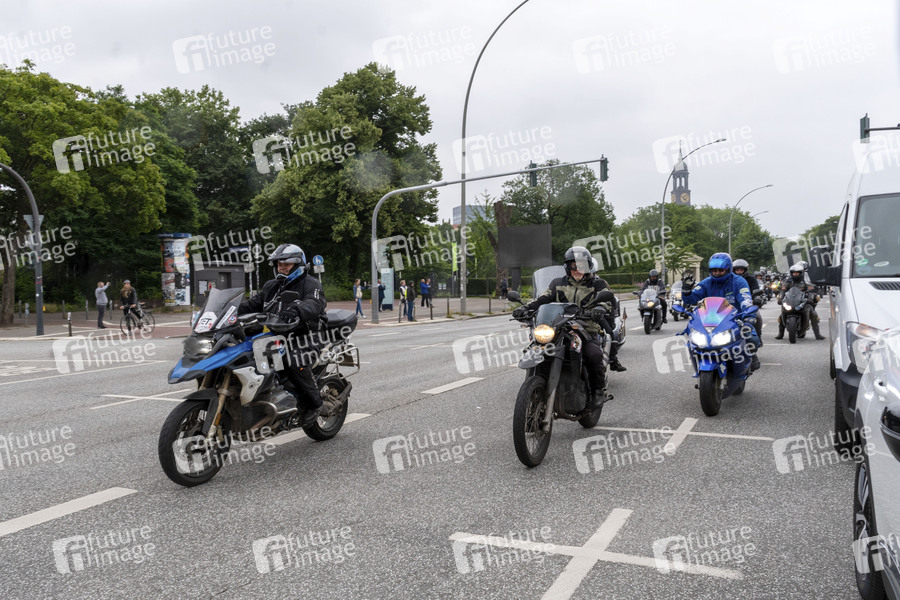 Motorrad-Demo auf der Reeperbahn. Tausende Motorradfahrerinnen und -fahrer haben am Sonnabendnachmittag auf St. Pauli gegen drohende Fahrverbote protestiert. Anlass für die Aktion war eine Initiative des Bundesrats zur Reduzierung von Motorradlärm. Die Länderkammer spricht sich unter anderem dafür aus, für Motorräder leichter Fahrverbote aus Lärmschutzgründen an Sonn- und Feiertagen zu ermöglichen. Außerdem sieht die Initiative vor, dass die Lautstärke neuer Maschinen auf maximal 80 Dezibel begrenzt werden soll. Hamburg, 04.07.2020