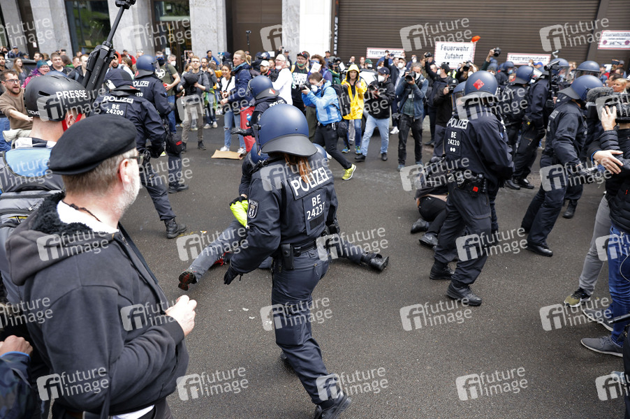 Protest, Demo, Demonstration, Corona-Maßnahmen-Kritiker, Corona-Hygieneregeln, Distanz, Mund-Nasen-Schutz, Protestierende, Demonstranten, Polizei, Polizisten, Polizeieinsatz, Gegner der Corona-Maßnahmen, Infektionsschutzgesetz, Corona-Notbremse, Eindämmung der dritten Pandemiewelle, Coronaleugner, Teilnehmer, Corona-Regeln, Pandemie, Corona-Demo, Coronademo, Querdenker, Querdenken, Gegendemonstranten, Corona-Leugner, Demo gegen Lockdown, Coronasdemo, Corona-Demo