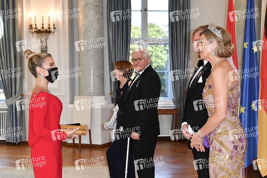 Sylvie Meis, Elke Büdenbender, Frank-Walter Steinmeier, König Willem-Alexander und Königin Maxima der Niederlande beim Defilee zum Staatsbankett zu Ehren von König Willem-Alexander der Niederlande und Königin Maxima, gegeben vom Bundespräsidenten und Elke Büdenbender im Schloss Bellevue. Berlin, 05.07.2021