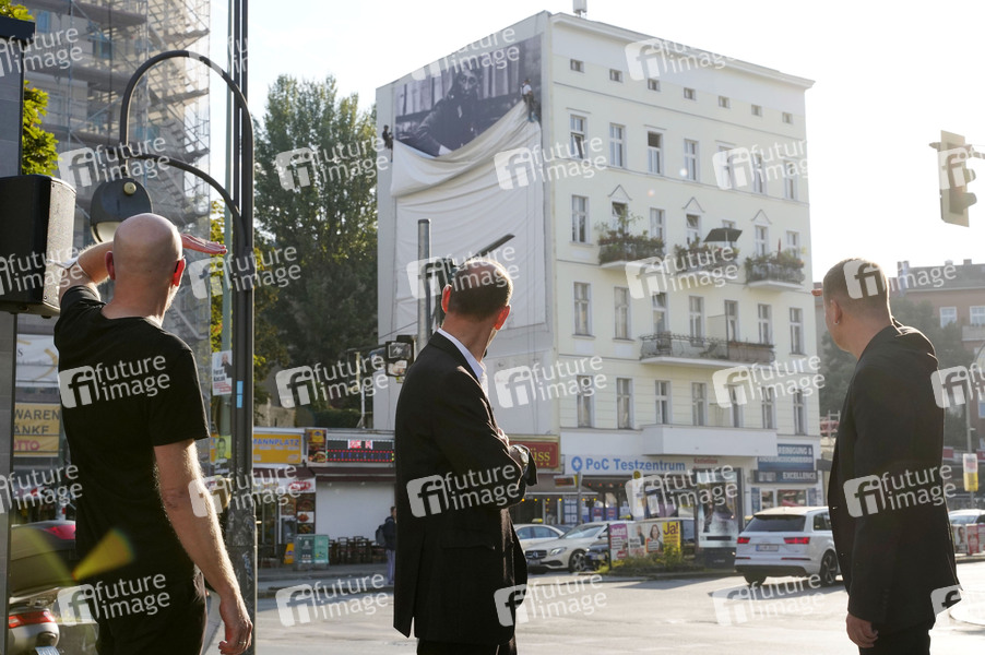Moritz van Dülmen, Axel Klausmeier und Klaus Lederer bei der Installation eines Großfotos zum 60. Jahrestag des Mauerbaus von Kulturprojekte Berlin und der Stiftung Berliner Mauer am Hermannplatz. Berlin, 13.08.2021