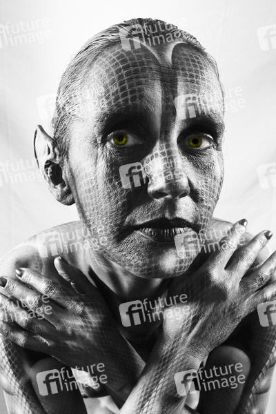Bodypainting, Erotik, Frau, nackt, drinnen, weiblich, Monster, Außerirdische, Alien, Echse, Körperkunst, Kunst, Malerei, monochrom, erotic, woman, nude, indoor, female, monochrome, lizard, body art, body painting
