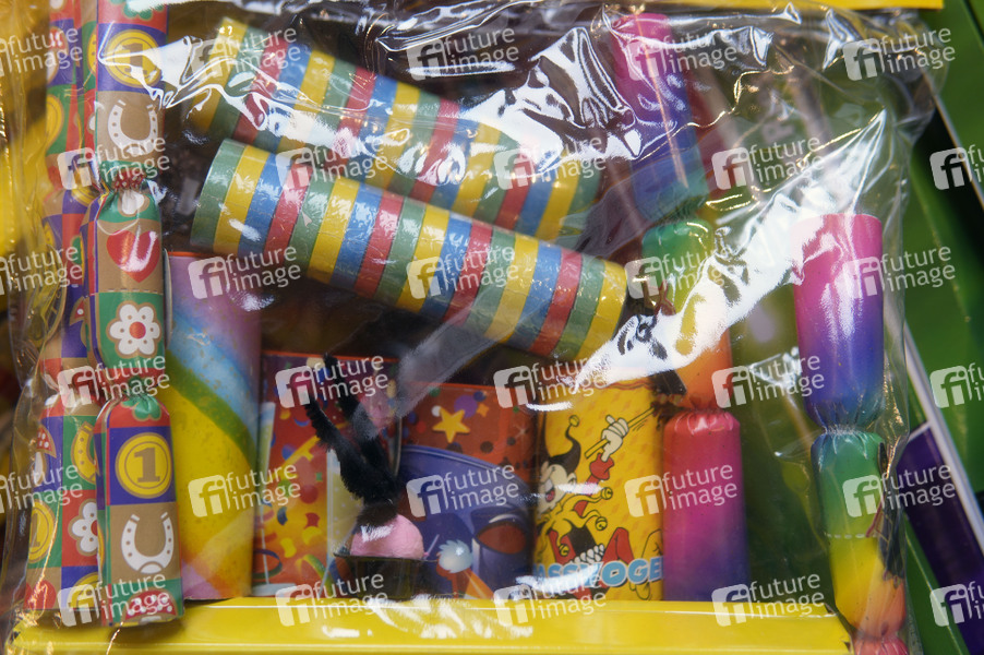 Ab Samstag den 28.12. ist der Verkauf von Feuerwerkskörpern 2024 erlaubt. Auch dieses Jahr wird eine große Nachfrage erwartet. Im Bild Luftschlangen, Knallbonbons und Tischknaller für Innenräume im Blisterpack in einem Supermarkt. (Symbolfoto, Themenfoto) Berlin, 28.12.2024