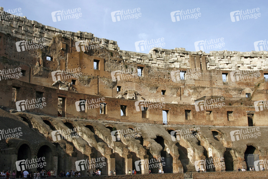 Antiker Name: Amphitheatrum Novum oder Amphitheatrum Flavium, der größte geschlossene Bau der römischen Antike, Fertigstellung im Jahr 80, es konnten ca. 50.000 Zuschauer Platz finden, das Kolosseum ist ellipsenförmig gebaut, Breite: 156 Meter, Länge: 188 Meter, Umfang: 527 Meter, Höhe: 48 Meter, es bestand aus drei übereinander angeordneten Arkadenreihen zu je 80 Bögen, als Arena war das Kolosseum über 400 Jahre lang in Betrieb, Veranstaltungsort von in aller Regel höchst grausamen Spielen, üblich waren vor allem Gladiatorenkämpfe (munera) und Tierhetzen (venationes)