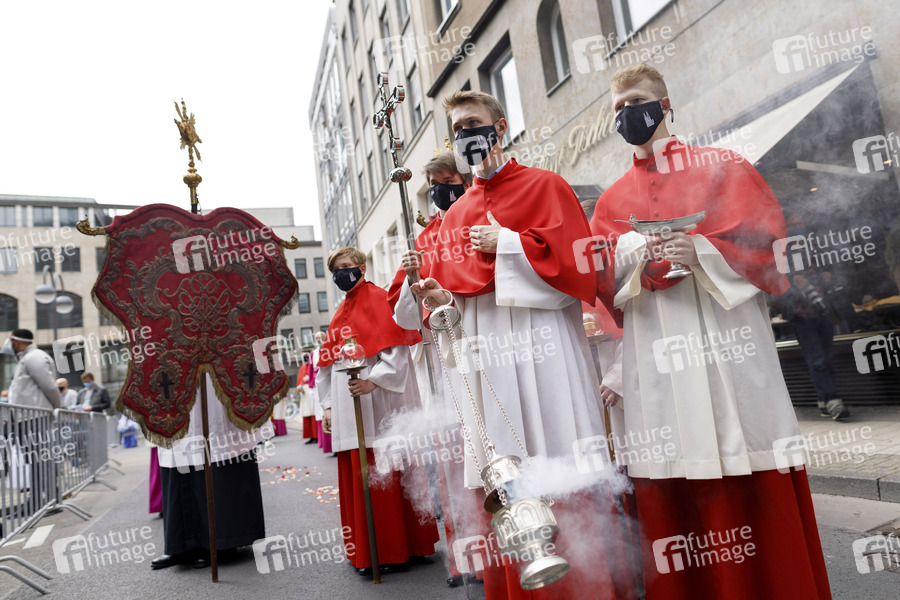Religion, Glaube, Prozession, Messe, Gott, Gottesfurcht, Katholizismus, katholisch, Christen, Christentum, Kölner Dom, Prozession, Fronleichnam, Fronleichnamsprozession, Umzug, Weihrauch, Erzbistum Köln, Erzbischof, Hochfest, Gottesdienst, Messe, Pontifikalamt, katholische Kirche, bleibende Gegenwart Jesu Christi im Sakrament der Eucharistie, Fronleichnamsgottesdienst, Maskenpflicht, Kirche, Kirche in Zeiten von Corona, Jesus, Christus, Coronavirus, Coronakrise