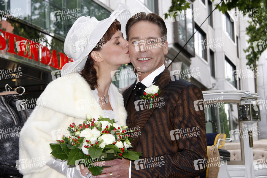 Das Brautpaar Jacques Breuer und Viola Wedekind mit der Hochzeitskutsche unterwegs vom Theater am Kurfürstendamm zur Hochzeitsfeier im Hotel Seehof