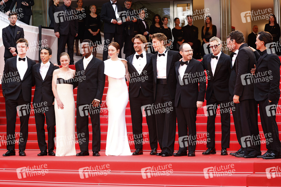 Cameron Mann, Matt Gomez Hidaka, Amelie Hoeferle, Micheal Ward, Emma Stone, Luke Grimes, Austin Butler, Ari Aster, Joaquin Phoenix, Lars Knudsen, Pedro Pascal und Clifton Collins bei der Premiere des Kinofilms 'Eddington' auf dem Festival de Cannes 2025 / 78. Internationale Filmfestspiele von Cannes im Palais des Festivals. Cannes, 16.05.2025