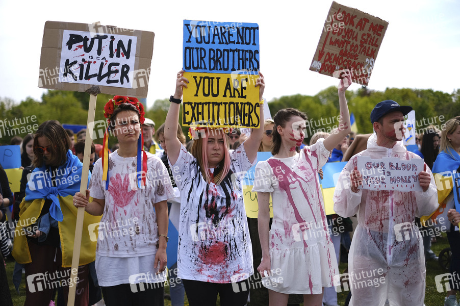 Unter dem Motto 'Right for existance - Mariupol 22' protestieren vor dem Reichstagsgebäude meist Ukrainer gegen den russischen Einmarsch in die Ukraine. Die fordern ein Gas- und Ölembargo gegen Russland und schwere Waffen für die Ukraine. Berlin, 30.04.2022
