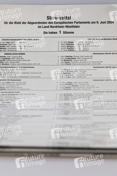 Stimmzettel zur Wahl der Abgeordneten zum 10. Europäischen Parlament am 9. Juni 2024 im Land Nordrhein-Westfalen für 34 Parteien. (Symbolfoto; Themenfoto)