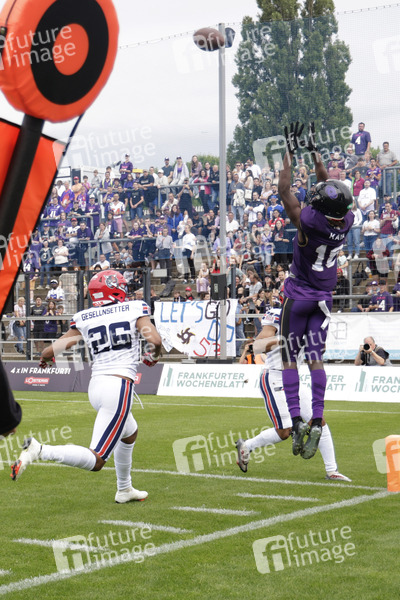 Marvin Omar Gesellnsetter (Hamburg Sea Devils DB) und Niklas Schumm (Frankfurt Galaxy WR) beim American Football-Spiel Frankfurt Galaxy gegen Hamburg Sea Devils in der PSD Bank Arena. Frankfurt am Main, 30.06.2024