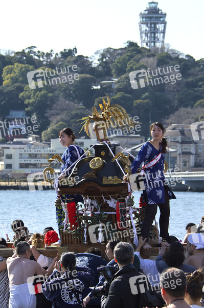 Teilnehmer auf einem tragbaren Schrein während einer Reinigungszeremonie am Strand Katase Higashihama. Fujisawa, 18.01.2026