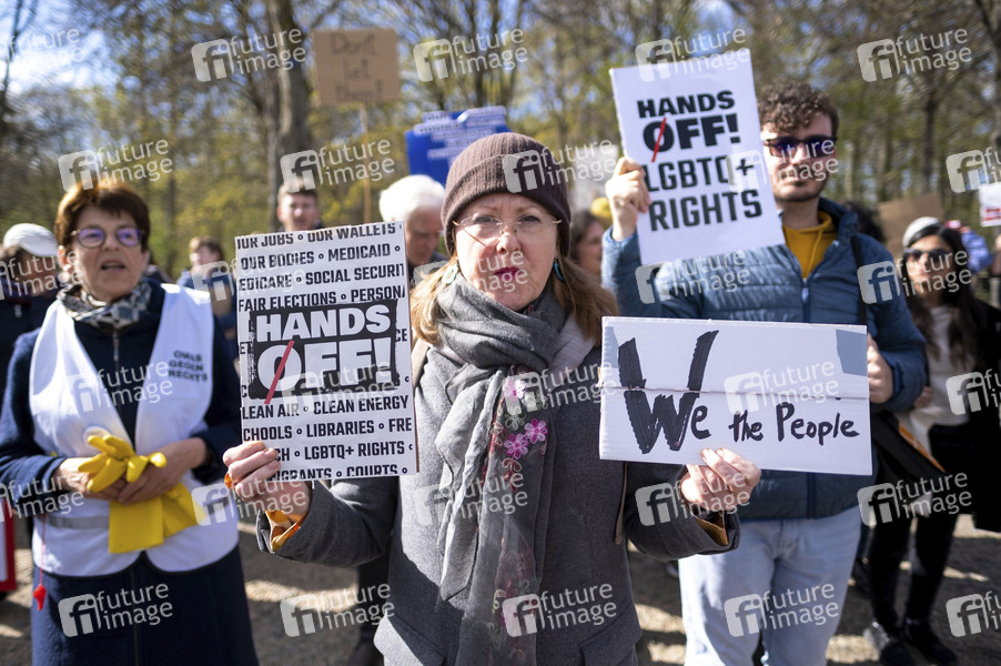 Amerikanische Staatsbürger, unter anderen von Democrats Abroad, protestieren unter dem Motto 'Hands Off' vor der US-Botschaft in Berlin gegen die Politik von Donald Trump und Elon Musk in den USA. Berlin, 05.04.2025