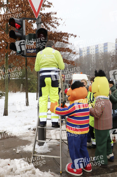 Ernie und Bert bei der Einweihung der Sesamstraße Ampelmännchen am Hugh-Greene-Weg. Hamburg, 13.01.2026
