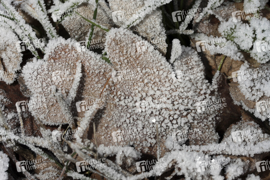 Blätter im Gras mit Rauhreif überzogen. Berlin, 03.01.2009