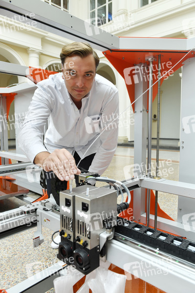 Chief Innovation Officer Daniel Büning beim Presse Pre-Opening des Fiction Forum der Kultur- und Kreativwirtschaft im Thaersaal der Humboldt-Universität und Vorstellung des BigRep One 3 D Druckers, welcher aus gebrauchten PET-Flaschen eine architektonische Installation druckt, die in der Kombination aus recycelten Druckmaterialien, Größe und Funktion weltweit einzigartig ist und völlig neue Dimensionen für nachhaltiges Bauen in Städten eröffnet. Berlin, 31.07.2019