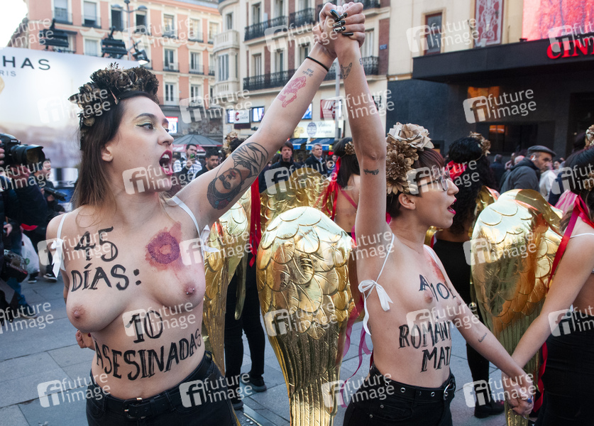 Femen Aktivistinnen bei einer Demonstration gegen Gewalt gegen Frauen am Valentinstag auf dem Plaza del Callao. Madrid, 14.02.2020