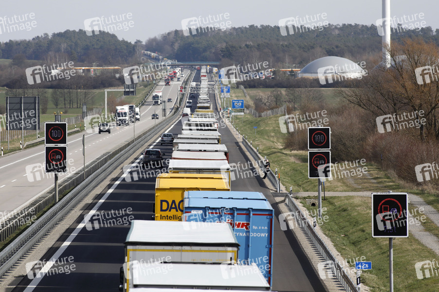 LKWs stehen auf der A12 in Fahrtrichtung Polen im Stau. Die Grenzen zwischen Polen und Deutschland sind wegen des Coronavirus geschlossen. Frankfurt (Oder), 16.03.2020