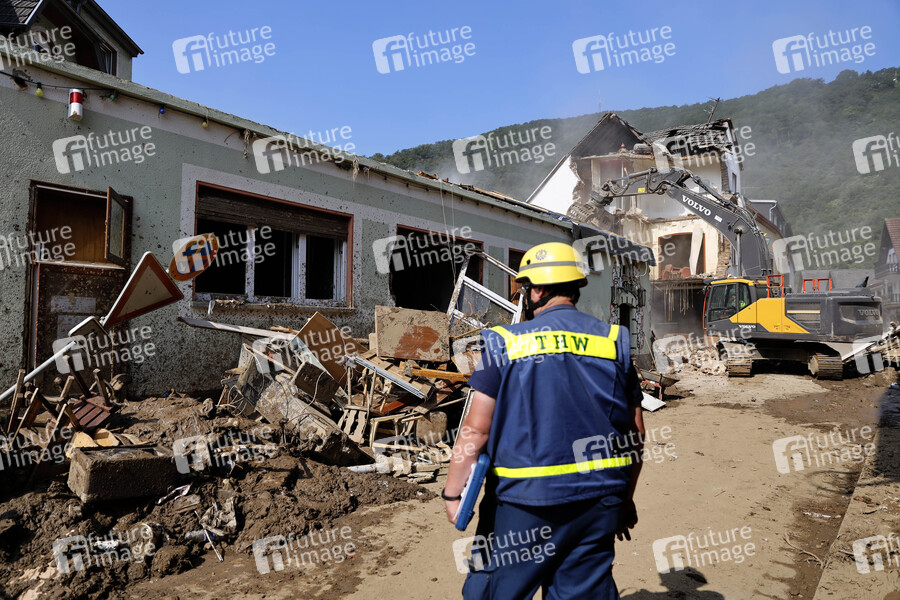 Nach dem Jahrhunderthochwasser in der Eifel durch heftige Regenfälle und Dauerregen mit Überschwemmungen und Überflutungen haben die Aufräumarbeiten im Ahrtal begonnen. Einheiten von Polizei, THW, Bundeswehr und Feuerwehr mitsamt vielen freiwilligen Helfern räumen Straßen, entfernen Schutt und Schlamm und versorgen die Menschen. Im Bild zerstörte Häuser in der Ortschaft Altenahr, in der die Flut viele Häuser zerstörte, 22.07.2021