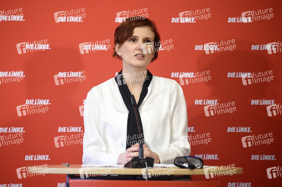 Katja Kipping bei einer Pressekonferenz zu aktuellen politischen Themen im Karl-Liebknecht Haus. Berlin, 15.02.2021