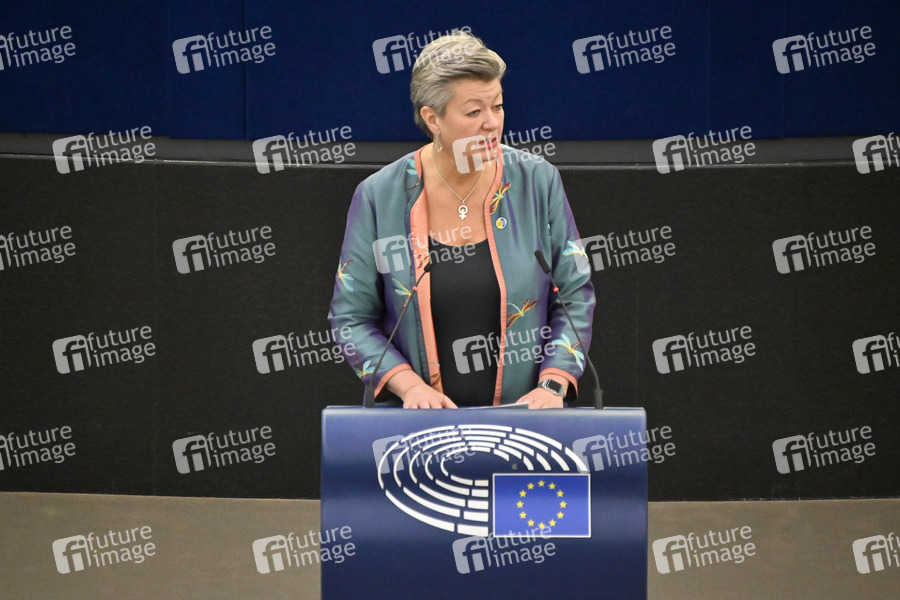 Krieg, Russland, Ukraine, Flucht, Hilfe. Flücthlinge, Europäisches Parlament, Plenum, Plenartagung, Plenardebatte, Plenarsitzung, Debatte, Rede, Politik, Strasbourg, Strassburg, Europaparlament, Europa-Politik, EU-Abgeordnete, EU-Parlament, EP, Parlament der Europäischen Union, European Parliament, European Union, Parlamentum Europaeum, MdEP, Mitglied des Europäischen Parlaments, Politikerin, Schweden, Sveriges socialdemokratiska arbetareparti, Kommissarin für Inneres der Europäischen Union