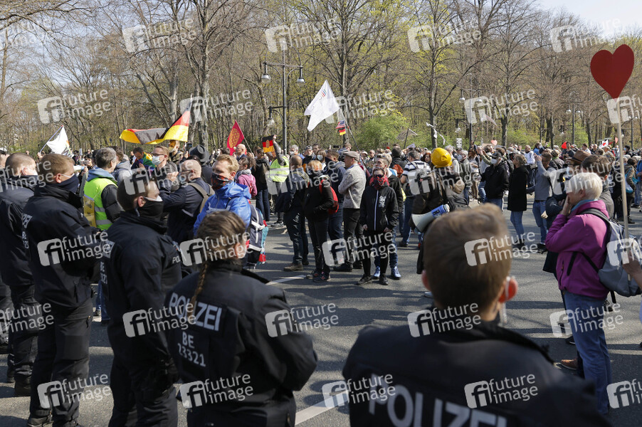 Tausende Demonstranten haben sich am Mittwoch auf der Straße des 17. Juni versammelt, um gegen die staatliche Corona-Politik zu protestieren. Wegen vielfacher Verstöße gegen die Corona-Auflagen wurde die Demo von der Polizei aufgelöst. Berlin, 21.04.2021