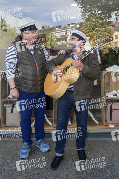 Klaus Baumgart und Claas Vogt von Klaus & Klaus beim Fototermin vor der Textildruckerei EINDRUCK, welche Mund-Nase-Masken mit dem echten Lächeln der Träger herstellt. Hamburg, 06.05.2020